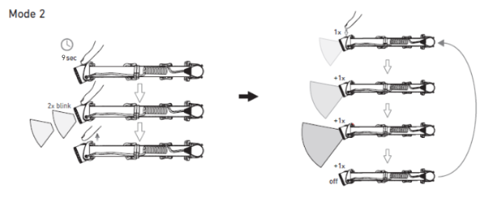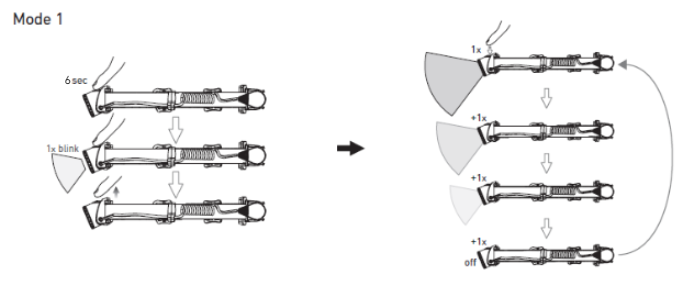 - Headtorch must be powered OFF > Hold Power button down for 6 seconds > Torch will blink x1 > Release Power Button.